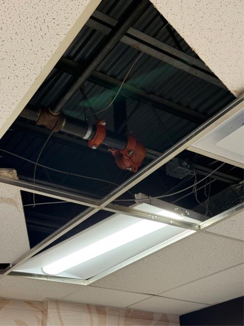 We just completed a pipe repair in response to a service call for a leaking fire protection pipe located above the tile ceiling at a health care facility. Our team replaced the damaged pipe and fittings with new materials, fully resolving the leak and restoring the system to proper working order.