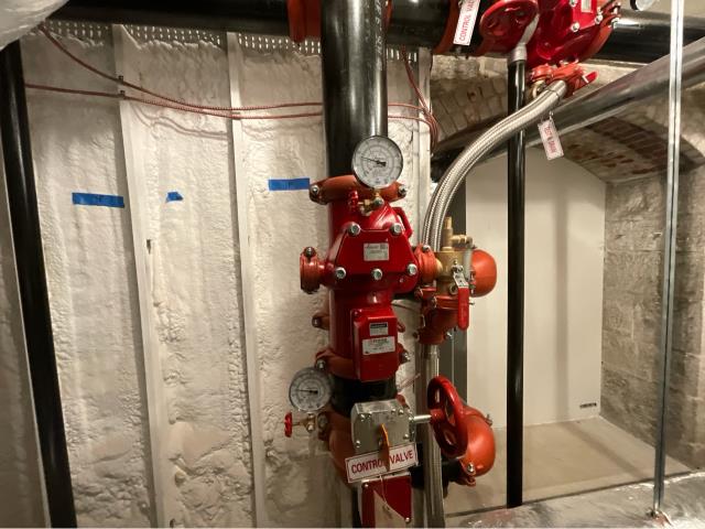 Finished replacing a section of corroded fire sprinkler line pipe. Removed damaged piping and installed new pipe to ensure system reliability and code compliance.